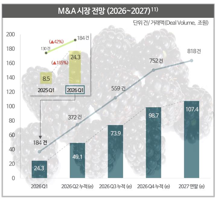 2026년 M&A 시장 전망과 성장 전략 보고서"1분기 거래액 185%증가한 24.3조, 연말 100조 근접할 것"사이버보안, 특수가스, 반도체후공정, 데이터센터, 화장품 부자재 등 유망