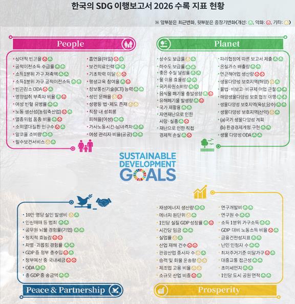 '한국의 SDG 이행보고서 2026' 발간 상대적빈곤율 전년대비 0.4%↑…OECD 9위 1인 온실가스배출 14t…ODA 사상 최고치 (국가데이터연구원) 2024년 우리나라의 처분가능소득 상대적 빈곤율(소득이 중위소득의 50% 이하인 사람의 비율)이 소폭 악화한 15.3%로 경제협력개발기구(OECD) 9위(2022년 기준) 수준인 것으로 나타났다. 2023년 기준 1인당 온실가스배출량은 14톤(t)으로 OECD 5위 수준으로 집계됐다. 국가데이터연구원은 30일 이러한 내용을 담은 '한국의 SDG(Sustainable Development Goals·지속가능발전목표) 이행보고서 2026'를 발간했다. SDG는 2015년 유엔총회에서 사람과 지구의 공동발전을 위해 2030년까지 달성하기로 합의한 17개 분야 정책 목표다. 보고서는 2011년부터 최근까지 시계열과 OECD 주요국과의 비교를 통해 SDG 관련 한국의 현 위치를 점검할 수 있도록 2021년부터 매년 발간하고 있다. 보고서에 따르면 한국은 혁신 역량과 경제·보건 수준은 OECD 상위권을 유지하는 등 SDG 5대 영역(사람·지구·번영·평화·협력) 전반에서 개선 흐름을 보이며 다수 지표가 긍정적인 지표를 보였다. 다만 상대적 빈곤, 성별 돌봄 부담, 기후·생물다양성 대응 등 사회적 포용과 환경 분야에서는 여전히 구조적 과제가 지속하는 것으로 분석됐다. 먼저 2024년 처분가능소득 상대적 빈곤율은 15.3%로 OECD 9위 수준이었다. 2011년(18.5%)에 비해 개선됐지만 전년(14.9%)에 비해 0.4%포인트(p) 증가했다. 66세 이상 은퇴연령 인구의 상대적 빈곤율은 37.7%였다. 장애 인구의 빈곤율은 35.4%로 비장애 인구(14.2%)의 약 2.5배에 달했다. 한국의 보편적 건강보장 지수(UHC SCI·모든 사람이 경제적 어려움 없이 언제나 양질의 보건 서비스를 이용할 수 있는지 여부)는 89점으로 OECD 국가 중 두 번째로 높았다. 2023년 인구 1000명당 주요 보건의료 인력은 9.3명으로 11년(5.5명)에 비해서는 3.7명 증가했지만 OECD(14.4명) 평균에는 미달했다. 인구 1000명당 의사 2.7명, 간호사 5.2명으로 OECD 평균(의사 3.9명·간호사 8.8명)보다 각각 1.2명, 3.6명 적었다. 2023년 한국 성인의 언어능력(249점)과 수리력(253점) 모두 2012년(273·263점)에 비해 하락했다. OECD 평균(260·206점)보다도 다소 낮았다. 가정관리·돌봄시간, 女가 男보다 2.8배↑…초미세 오염도 OECD 4위 성평등 증진 법적 체계 마련 여부 평가에서 한국은 OECD 38개국 중 법적 기반과 공적생활 영역(90점)은 상위권이나 고용과 경제적 권리 영역(70점)은 최하위권으로 나타났다. 2024년 가정 관리와 가족 돌봄에 여성은 하루 시간의 11.5%, 남성은 4.0%를 사용해 여성이 남성보다 2.8배 더 많은 시간을 쓰는 것으로 나타났다. (국가데이터연구원) 2023년 온실가스 총배출량은 전년(7억2203만t) 대비 2.1% 감소한 7억720만t으로 2018년(7억8014만t)에 정점을 기록한 뒤 감소 추세다. OECD 국가 중 한국의 1인당 온실가스배출량은 14t으로 호주(20t), 미국(18.6t), 캐나다(18.0t), 뉴질랜드(15.2t)에 이어 5번째였다. 2024년 한국의 신재생에너지 생산량은 1881만3000toe(석유환산톤)다. 1차 에너지 총생산량 중 6.19%로, 2011년 생산량(357만toe) 및 비중(1.33%) 대비 약 5배 증가했다. 2024년 초미세먼지 오염도의 인구 가중 평균은 16㎍/㎥로 관측 이래 최저, '나쁨' 등급 발령 일수(12일)도 2015년 이후 최소치였다. 다만 국내 대기환경기준(15㎍/㎥) 및 세계보건기구(WHO) 권고기준(5㎍/㎥)에는 미치지 못하는 수준이며, 2023년 기준 OECD 중 네 번째로 높은 오염도다. 2024년 여성 임금은 남성 임금의 70.9%로, 직종별로는 관리직 임금이 전체 평균의 314.7%로 가장 높았다. 2024년 국내총생산(GDP) 대비 노동소득 비율은 58.9%로 OECD 평균(55.0%)보다 높았다. 2024년 살인범죄 발생비는 인구 10만명당 0.54건으로 2011년(0.85건)에 비해 37.0% 감소했지만 2022년부터 0.54건으로 정체되고 있다. 국민이 느끼는 정치 효능감 수준은 2024년 2.5점(5점 만점)으로 2010년대(2.7~2.9점)에 비해 다소 낮아졌다. 개발도상국을 지원하기 위한 2024년 한국의 ODA 규모는 전년(31억6000만달러) 대비 27.6% 증가한 40억3000만달러, 국민총소득(GNI) 대비 ODA 비율 0.21%로 사상 최고치였다. 취약국에 대한 지원은 2023년 9억8000만달러로 전체 양자원조(26억6000만달러)의 36.8%로 이 중 개발협력이 86.7%, 평화 구축과 인도적 지원 비중은 각각 8.5%, 4.8%로 나타났다.