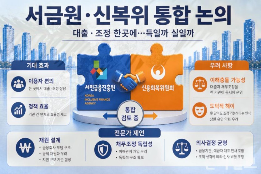 서민금융진흥원(서금원)과 신용회복위원회(신복위) 통합 논의가 검증 단계에 들어서면서 기대와 우려가 동시에 부각되고 있다.