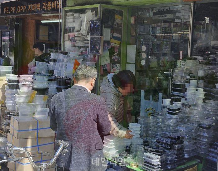 7일 서울 중구 방산시장 내 한 포장용품 제작 업체에서 자영업자들이 일회용 플라스틱 포장용기를 보고 있다. ⓒ데일리안 김찬주 기자