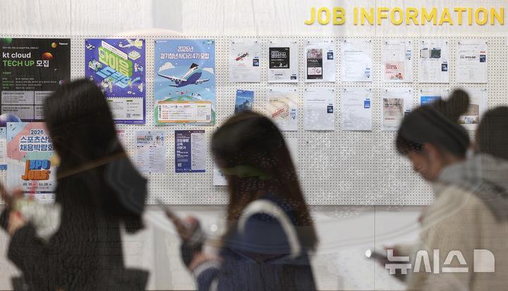 [서울=뉴시스] 이영환 기자 = 서울 성북구의 한 대학교 일자리플러스센터 일자리정보 게시판에 채용공고가 게시되어 있다. 2026.03.18. [email protected]