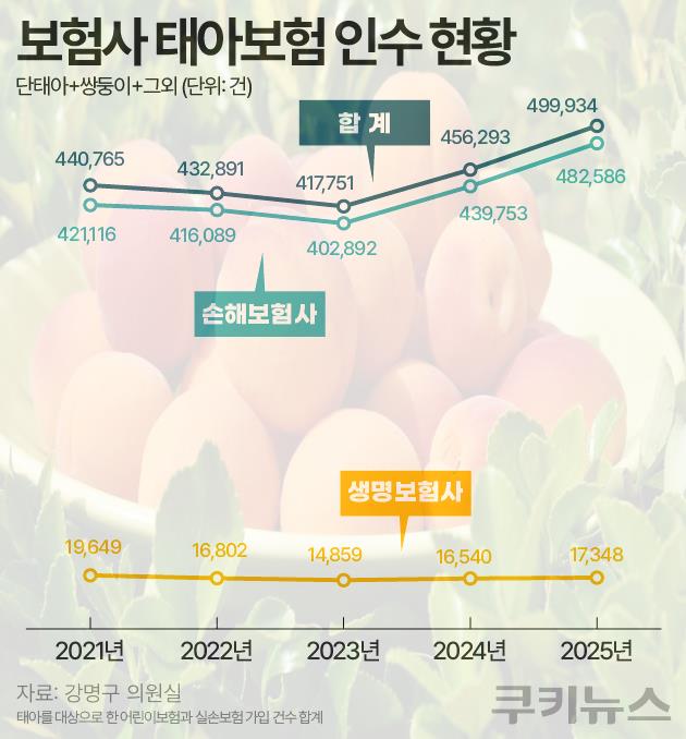 23일 금융감독원이 국회 강명구 국민의힘 의원실에 제출한 자료에 따르면, 지난해 태아보험을 판매한 10개 손해보험사(삼성화재·현대해상·KB손해보험·DB손해보험·메리츠화재·한화손해보험·흥국화재·롯데손해보험·농협손해보험·MG손해보험)의 태아보험 인수 건수는 48만2586건으로 집계됐다. 최근 5년 중 가장 많은 수준이다. 전년(43만9753건)보다 9.7% 증가했다. 손보사 인수 건수는 2021년 42만1116건에서 2022년 41만6089건, 2023년 40만2892건으로 감소하다가 2024년 43만9753건으로 반등한 뒤 지난해까지 증가세를 이어갔다.
