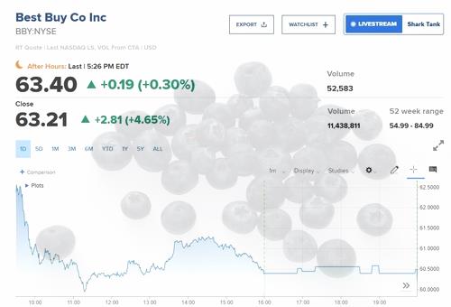 26일(미국 현지시각) 뉴욕증시에서 베스트바이 주가는 전날보다 2.81달러(4.65%) 오른 63.21달러에 거래를 마감했다.