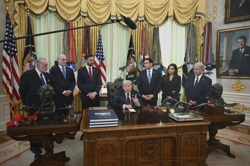 도널드 트럼프 미국 대통령(가운데)이 23일(현지시간) 미 백악관 집무실에어 이스라엘과 레바논 고위 관계자와 회담 후 발언하고 있다. 트럼프 대통령은 이날 이스라엘과 레바논의 휴전이 3주 연장될 것이라고 밝혔다. /AFPBBNews=뉴스1
