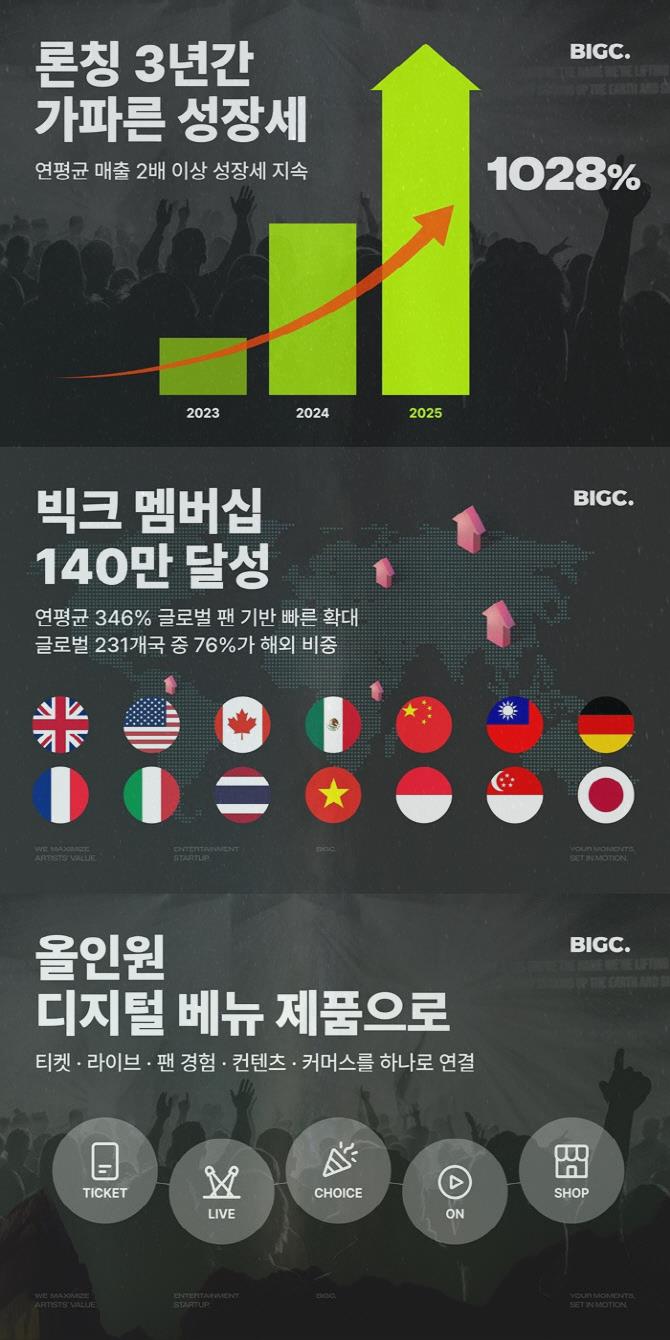 [이데일리 이윤정 기자] 글로벌 엔터테크 기업 빅크(BIGC)가 전 세계 공연 팬 경험을 하나로 연결하는 ‘올인원 디지털 베뉴(All-in-one Digital Venue)’ 플랫폼을 기반으로 지난 3년간 누적 매출 1028% 성장을 기록하며 빠르게 성장하고 있다.