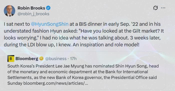 미국 브루킹스 연구소 로빈 브룩스 선임연구원이 2022년 가을 신현송 국제결제은행 경제보좌관과 나눈 대화를 소셜미디어에 공개하며, 신 내정자가 영국 국채시장의 위험 징후를 미리 감지했음을 밝혔다. 3주 뒤 영국에서 LDI 사태가 발생해 국채시장 혼란이 현실화됐다.