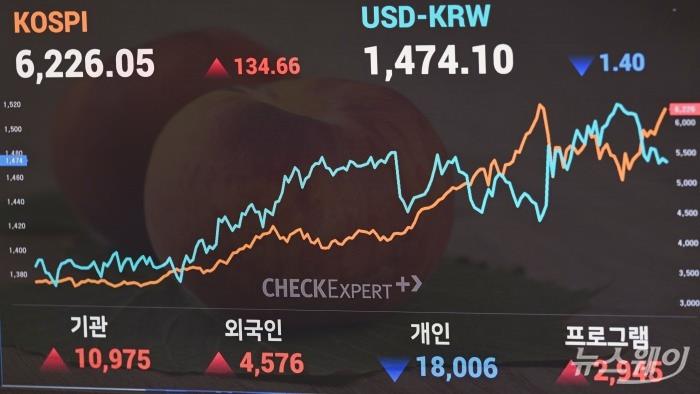 코스피가 미국과 이란 전쟁 개전 이후 첫 6200선으로 회복 마감한 16일 오후 서울 여의도 한국거래소 현황판에 코스피 지수 종가와 원달러 환율이 보이고 있다. 이날 코스피는 전 거래일 대비 134.66포인트(2.21%) 오른 6226.05, 코스닥은 10.54포인트(0.91%) 상승한 1162.97로 장을 마감했다. 사진=강민석 기자