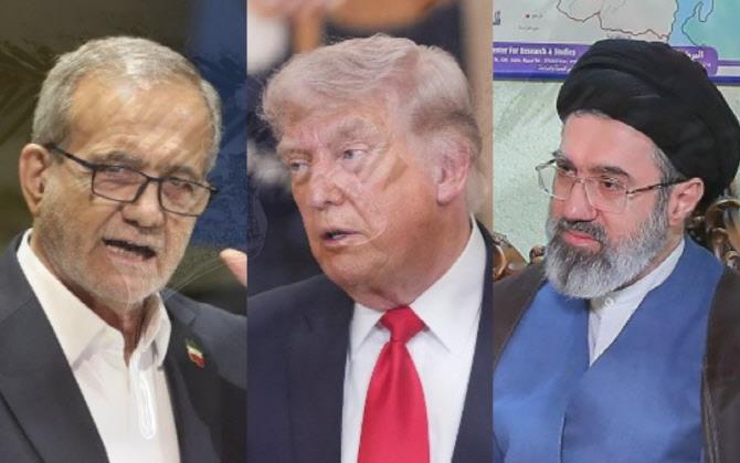 마수드 페제시키안 이란 대통령(왼쪽부터), 도널드 트럼프 미국 대통령, 모즈타바 하메네이 이란 최고지도자.