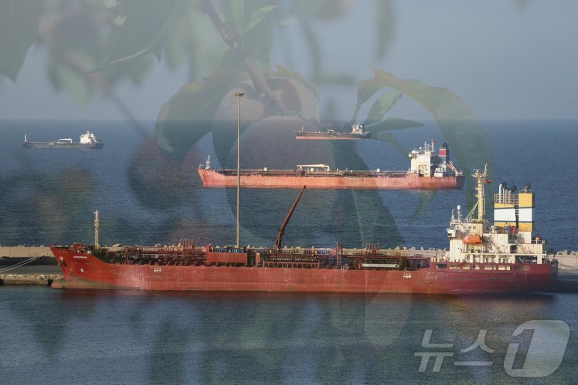 이란 전쟁 장기화로 호르무즈 해협 봉쇄가 지속되자 오만 무스카트항 인근에 루오지아산 유조선이 정박해 있는 모습. ⓒ로이터=뉴스1