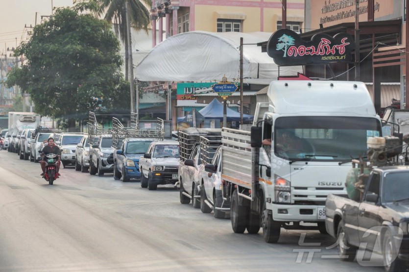 2026년 3월 16일 태국 방콕 외곽 나콘파톰 주에서 운전자들이 차량에 연료를 주입하기 위해 주유소 앞 도로에 줄지어 서 있다. 2026.03.16. ⓒ 로이터=뉴스1